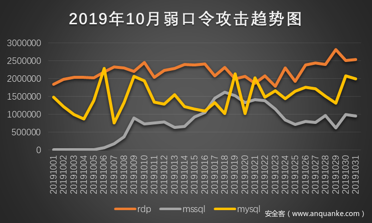 除此以外,360安全大脑通过对10月份弱口令攻击趋势发现, MsSQL的攻击趋势在10月6号和10月8号有两次显著增长,这主要是由于从10月6日起MyKings黑客组织增加其攻击投入,除了频繁更新僵尸程序的通信地址外,还发起新一轮针对MsSQL数据库的暴力破解攻击,意图控制更多的服务器组成更大规模的挖矿僵尸网络。
