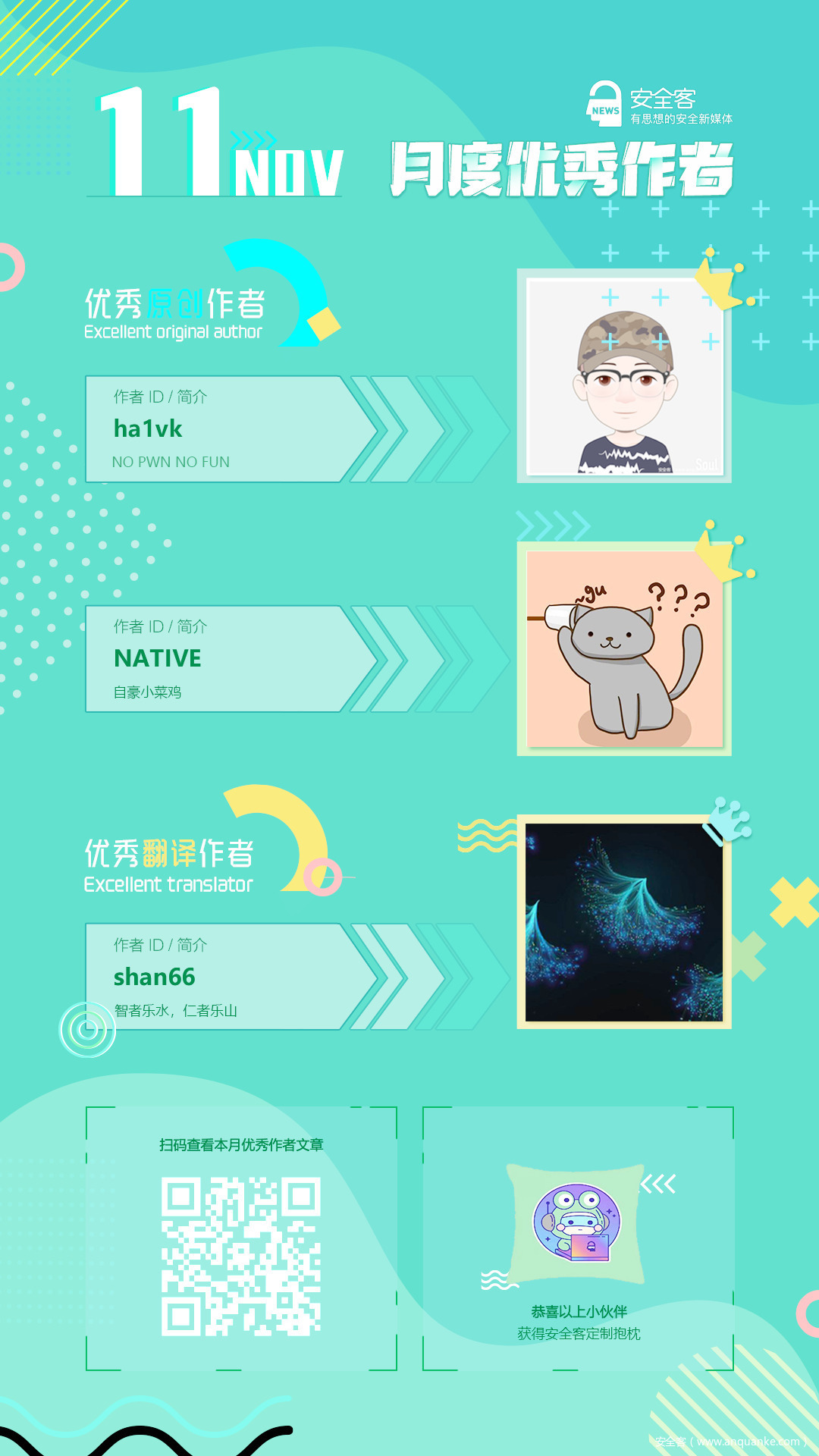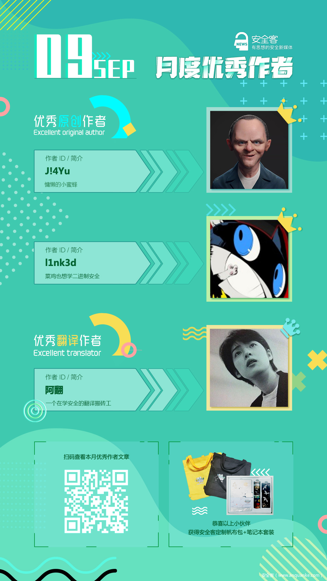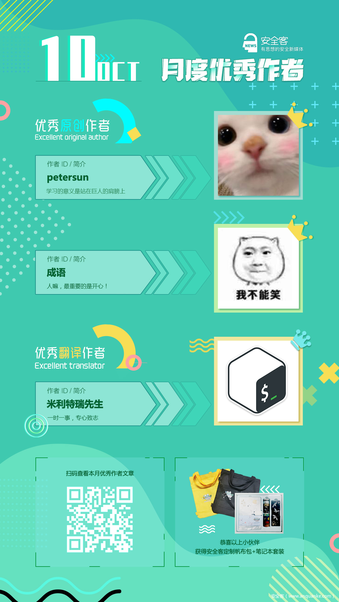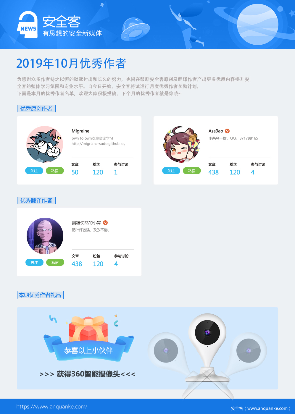 经甄选,10月我们选出了2名原创作者,1名翻译作者。恭喜他们被评选为安全客10月优秀作者,获得由安全客送出的360智能水滴摄像头一个!