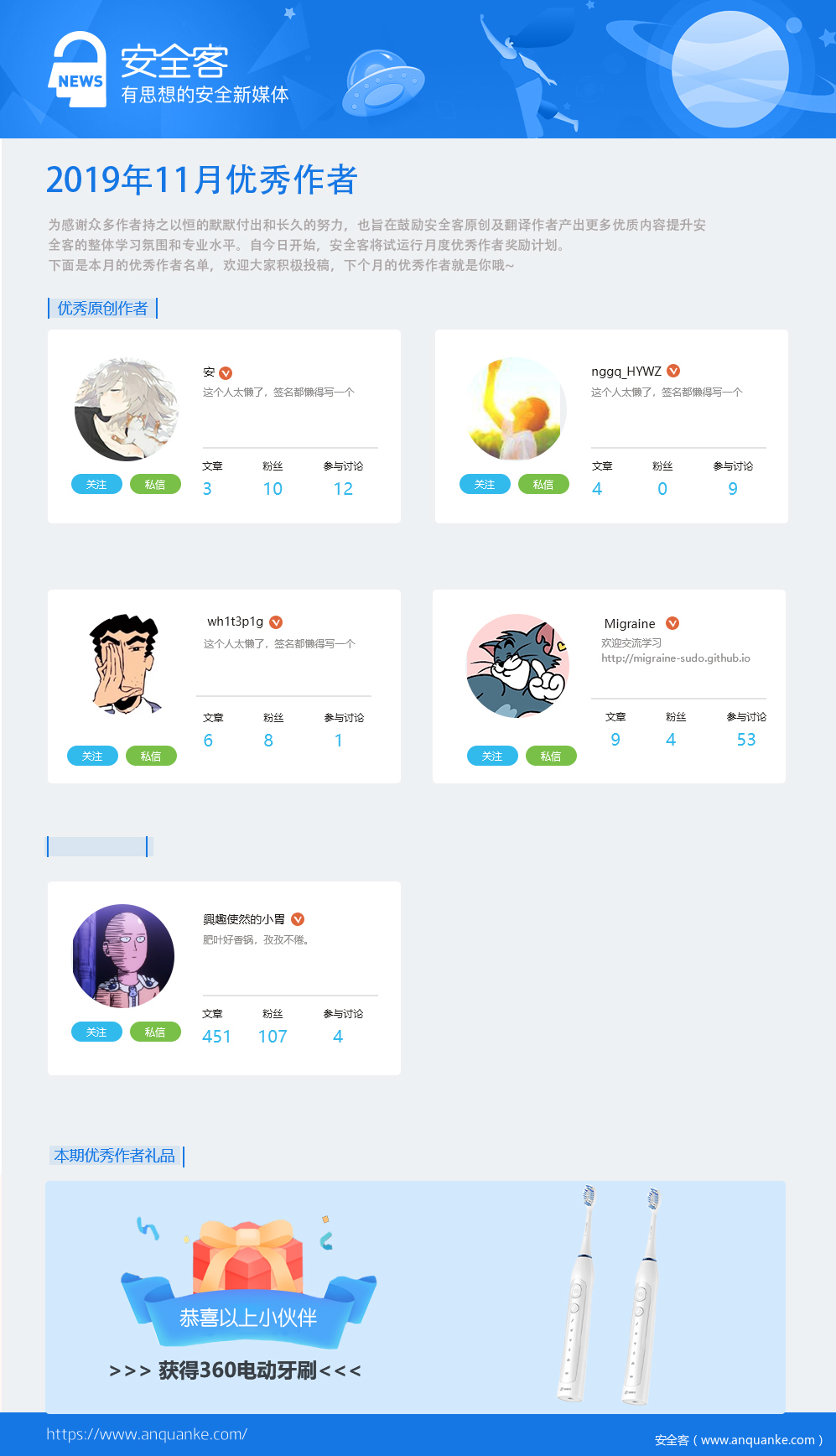 10月月度优秀作者公布