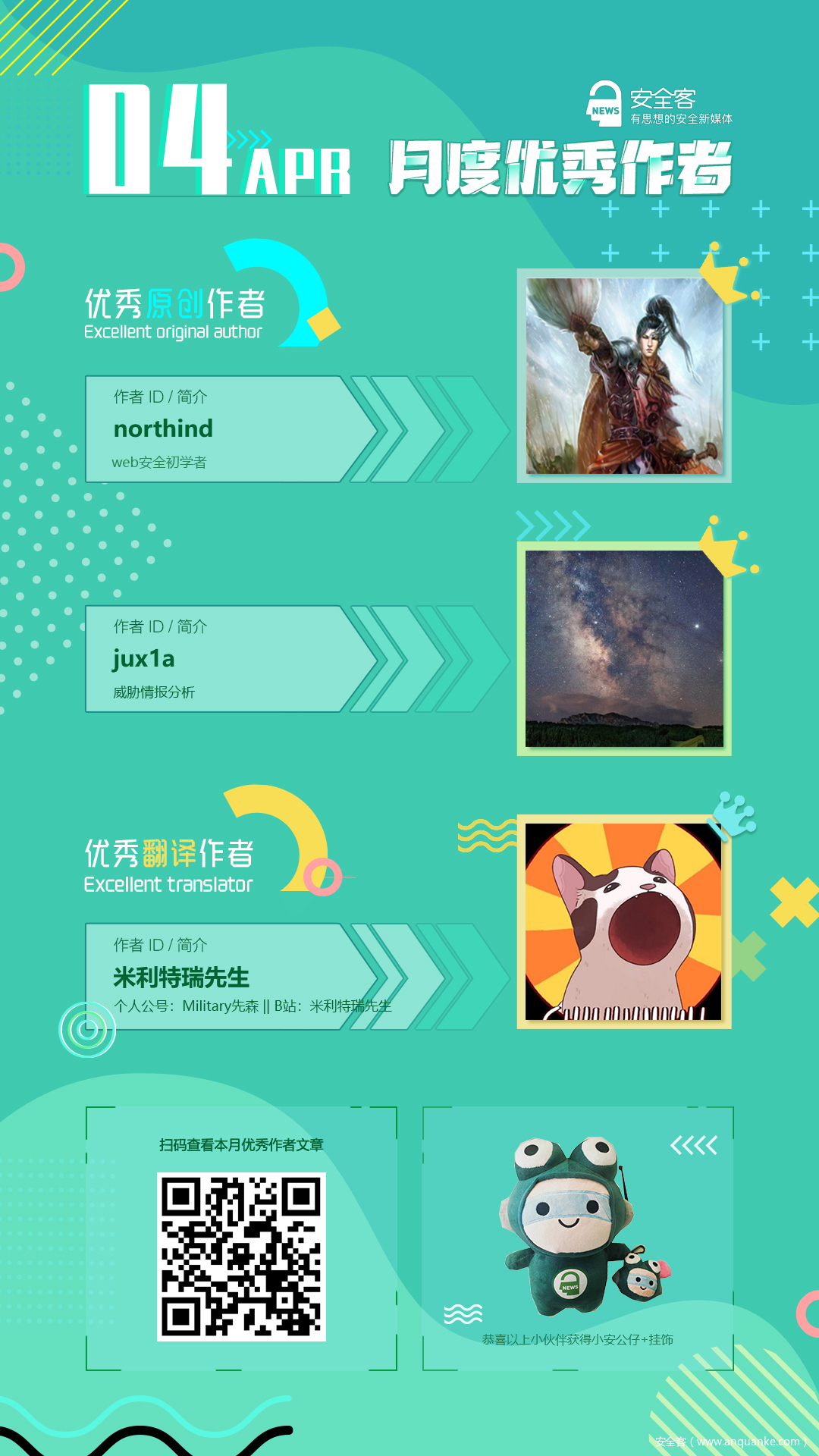 以下为安全客1月~4月的月度优秀作者,感谢他们在疫情期间仍不断耕耘,努力产出,为安全客输出优质文章~
