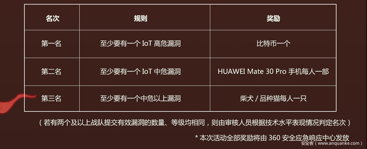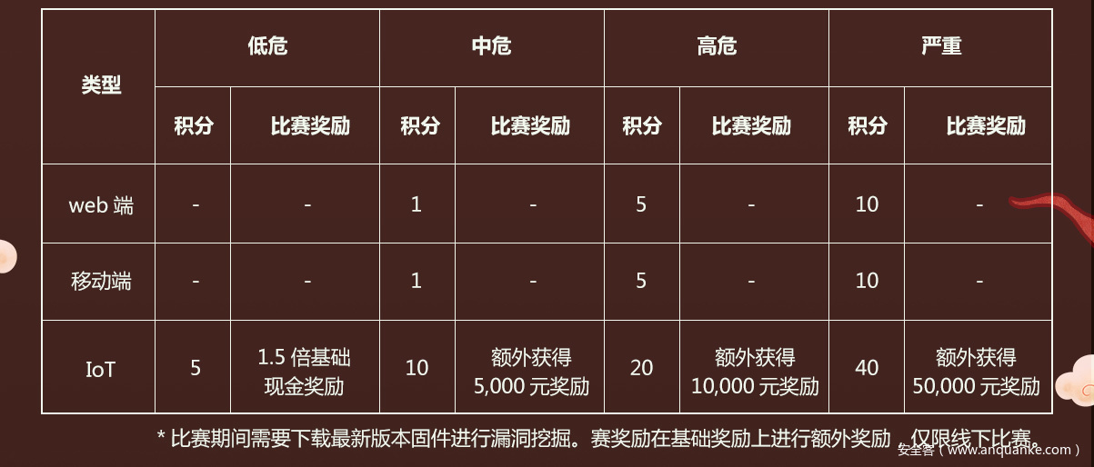 比赛以漏洞数量和类型计分排名,web端、移动端有效漏洞发放基础奖励;IoT端有效漏洞发放额外现金奖励。(组合型漏洞奖励标准遵从IoT漏洞):