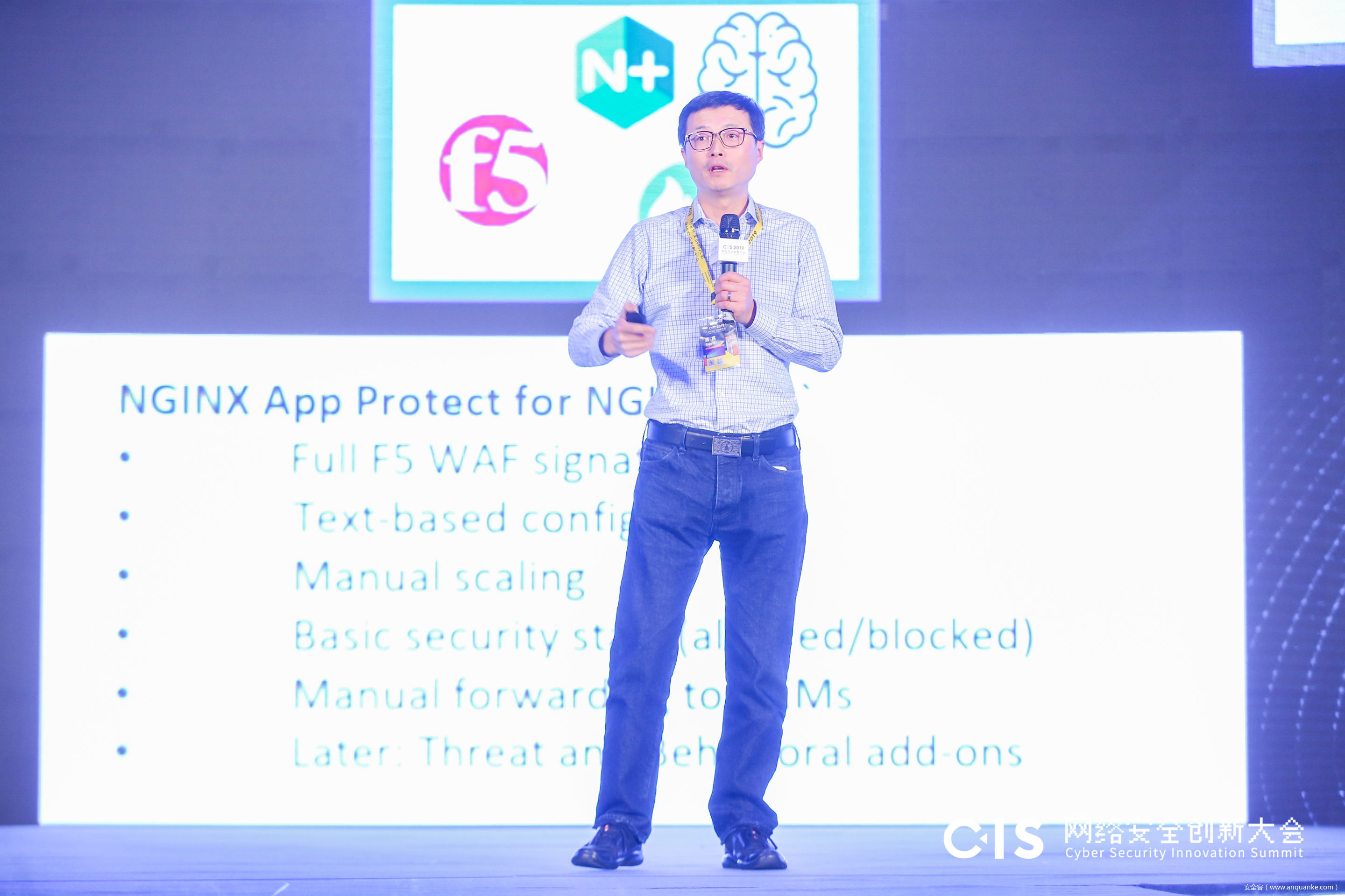 在下午企业安全创新分享的会场上,来自F5 的大中华区技术负责人吴静涛在大会现场为我们带来了议题为“F5融合Nginx, 开启数字原生态之路”的演讲。