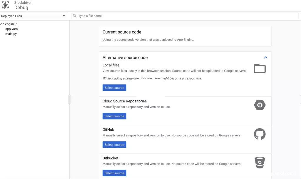 在阅读这篇好文后,我对GAE进行了测试。在测试中发现Google Cloud Platform Stackdriver中有一个调试应用,用户可以向该应用导入源代码并进行调试。用户可以从Github,Gitlab或者Bitbucket中导入源代码,并直接在Stackdriver Debug页面中调试代码(详情见此)。