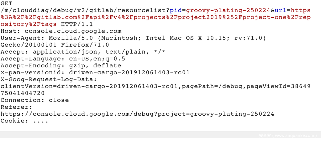 所幸的是请求中没有CSRF请求头,但是仍然有些请求头可能会阻止我们利用这个漏洞。比如x-pan-versionid、X-Goog-Request-Log-Data和网址为https://console.cloud.google.com/的Referer。如果在后端检查是否设置了这些请求头,同时验证Referer域名是否和发出SSRF请求前的console.cloud.google.com一致的话,漏洞就没法利用了。幸运的是,后端没有进行验证。