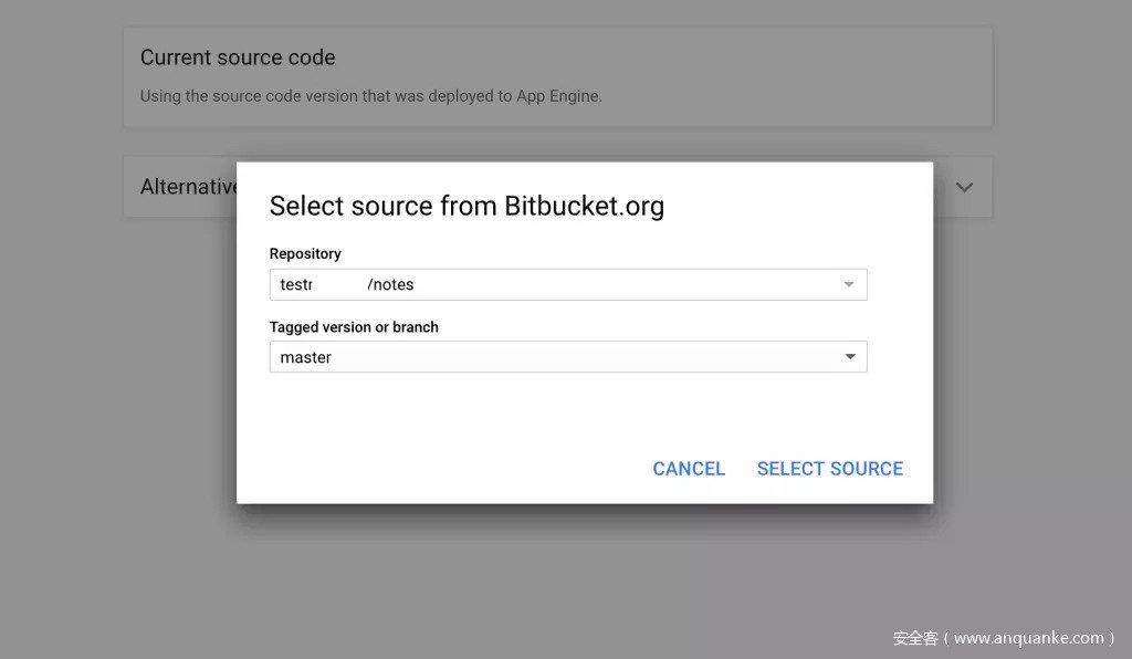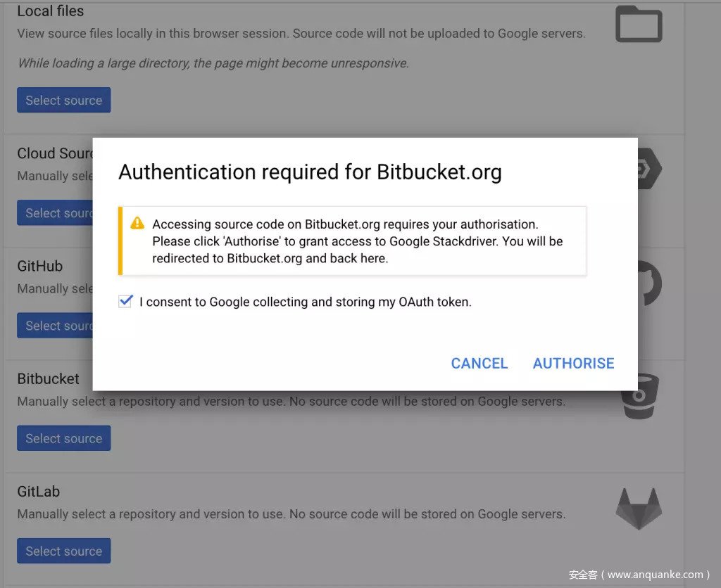 单击Bitbucket上的“Select Source”按钮会弹出一个授权页面,问你是否允许Google在该应用中存储oauth令牌。