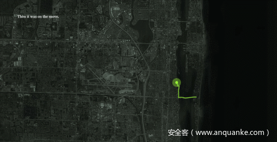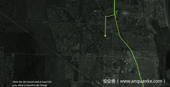 数据显示,上午7:10,在佛罗里达州棕榈滩海湖庄园,总统在这里大约停留了一个小时。(图中绿色绿点为特朗普随行人员的确切位置)