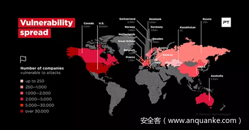 截止目前,专家已经确定,在全球158国家中,至少有80,000家公司面临潜在风险,其中38%的企业分布在美国,其次依次为英国、德国、荷兰和澳大利亚。中国也有超1300家公司受到影响。
