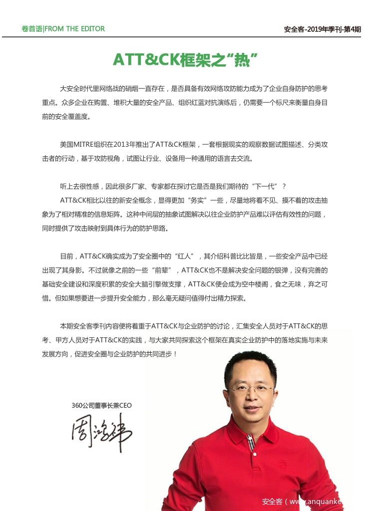 安全客2019季刊-第四季收录了数十篇优秀技术文章,涵盖本季度热门的六篇ATT&CK文章以及安全研究、漏洞分析、政企安全、随笔杂谈等五大季度热点方向,你,不容错过!