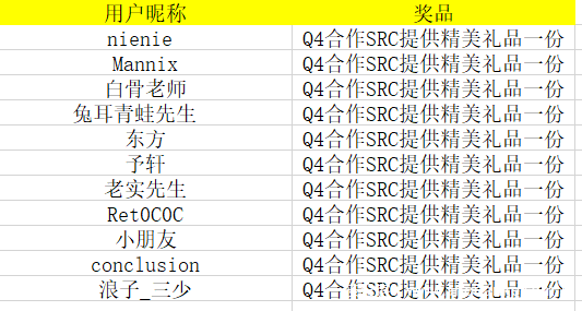 恭喜以上小伙伴获得Q4合作SRC提供精美礼品一份, 请在1月13日18:00前,加入安全客活动3群:830462644,联系管理员@安全客发送邮寄地址吧~