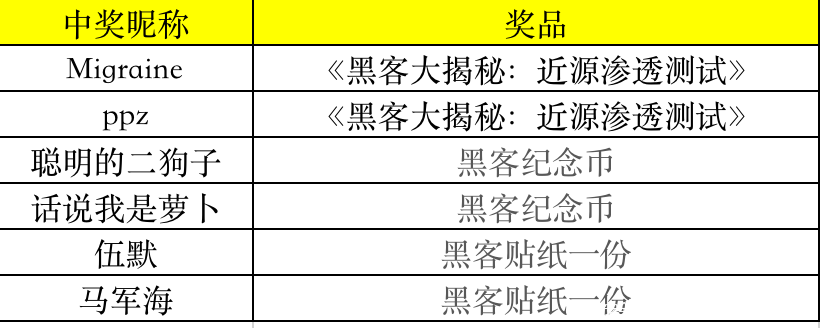 中奖名单公布以下是官网评论中奖名单,恭喜以上小伙伴获得《黑客大揭秘:近源渗透测试》1本, 请在1月8日18:30前,加入安全客活动3群:830462644,联系管理员@安全客发送邮寄地址吧~