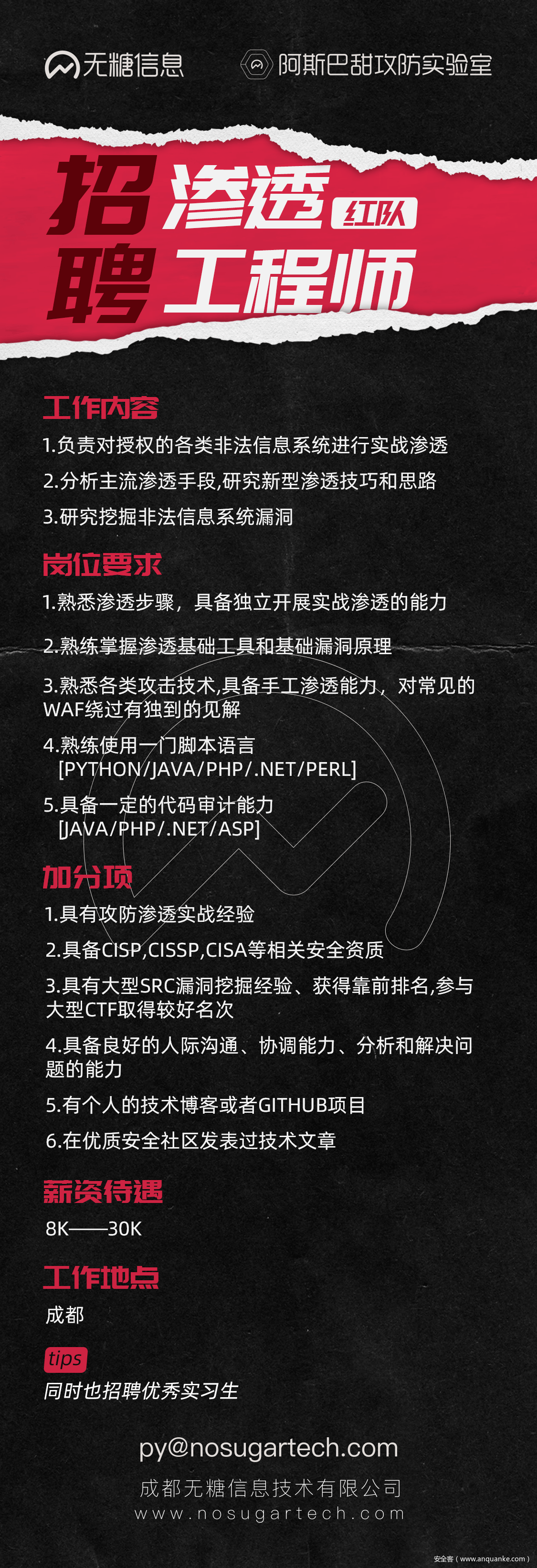 简历请投递至:py@nosugartech.com (请注明来自安全客)