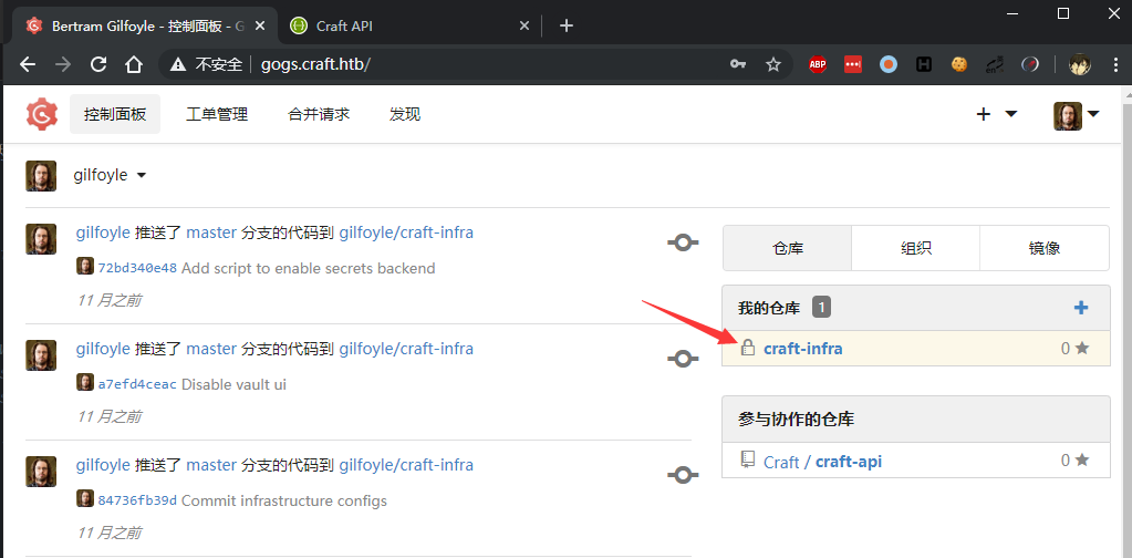 访问 https://gogs.craft.htb/ ,是一个go语言的开源git服务