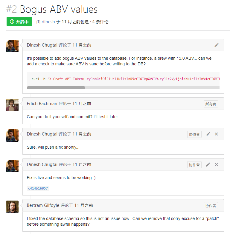 大概内容是一位印度小哥发现可以填写一个伪造的ABV(查了一下,是Alcohol by Volume,酒精度数),小哥建议在写入数据库前进行检测。项目作者表示“要不你来写,我来测试”。最后,一位胡子大叔提到,他已经修复数据库,建议移除印度小哥写的patch,以防发生意外。看来印度小哥写的代码有点问题。
