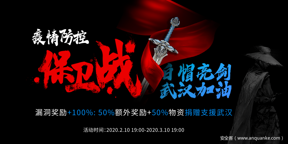 在此期间提交的所有有效漏洞,在原有奖励标准基础上,白帽子还将额外获得50%的奖励,另有50%奖励等值的医疗物资,将被捐赠给武汉等湖北重灾区。相信在全国人民和全世界人民的共同努力下,我们一定会大获全胜!