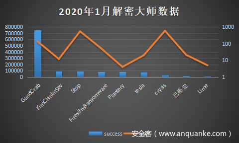 2020年1月,360解密大师新增对“已锁定”和CHERNOLOCKER勒索病毒家族的解密支持。从其整体解密统计数据看,本月解密量最大的仍是GandCrab家族,而在使用360解密大师解密文件的用户中,Stop勒索病毒中招用户的数量居于首位。