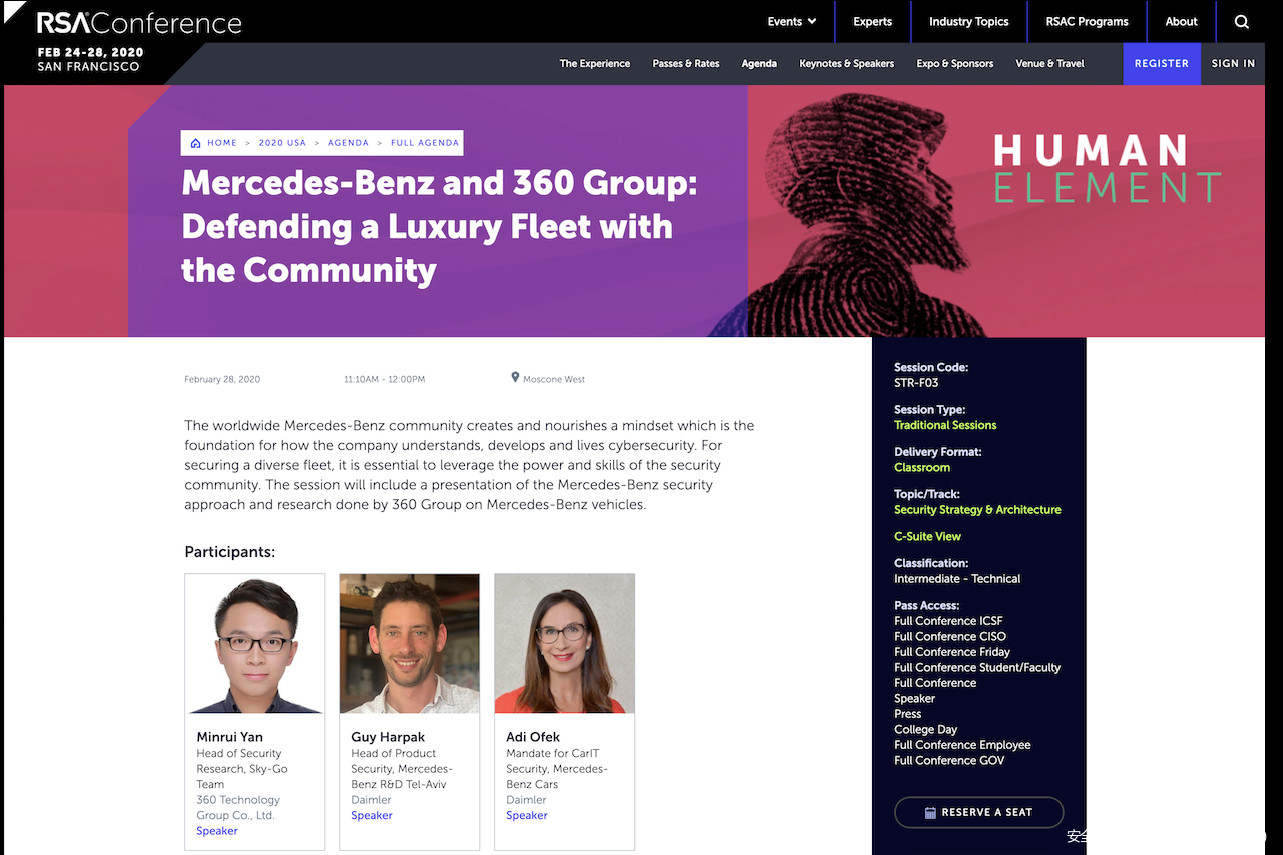 2月28日, 360将携手梅赛德斯-奔驰亮相RSA 2020 “Security Strategy & Architecture”(安全策略与架构)会议,360 Sky-Go安全研究团队负责人严敏睿 和 梅赛德斯-奔驰研发中心产品安全负责人盖·哈帕克将共同进行“Mercedes-Benz and 360 Group: Defending a Luxury Fleet with the Community ”( 梅赛德斯-奔驰携手360集团,与安全社区共同护卫高档车型)的主题演讲,就智能汽车所带来的安全风险和隐患进行探讨。