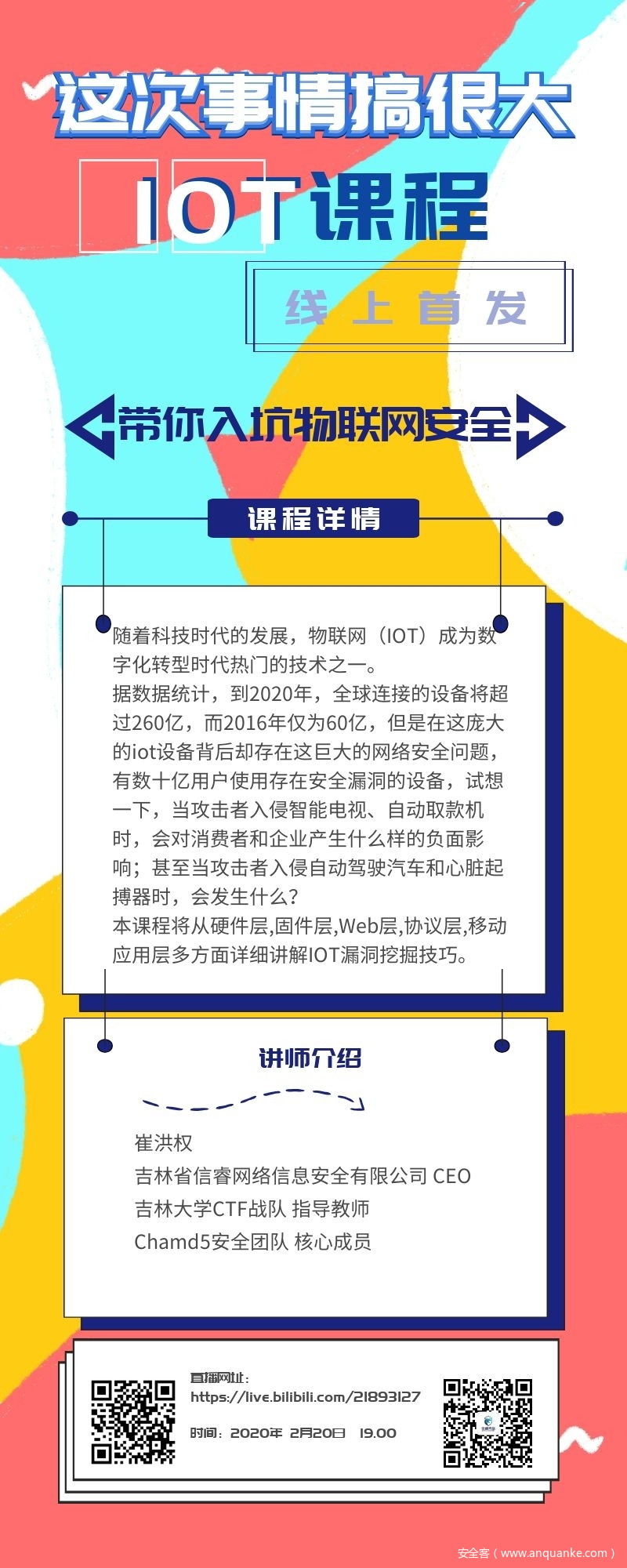 本课程将从硬件层,固件层,Web层,协议层,移动应用层多方面详细讲解IOT漏洞挖掘技巧。