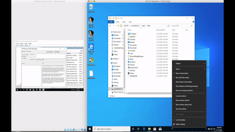 在上图中,左侧为域控制器,右侧为连接域控的主机。从图中可知,域控在用户组策略中设置了“Remove Task Manager”规则,在域用户的主机上右键单击任务栏,我们就能看到灰色的“任务管理器”。然而在%USERPROFILE%目录中释放我们精心构造的NTUSER.man文件后,当用户注销/登录后,这个规则将不再生效。