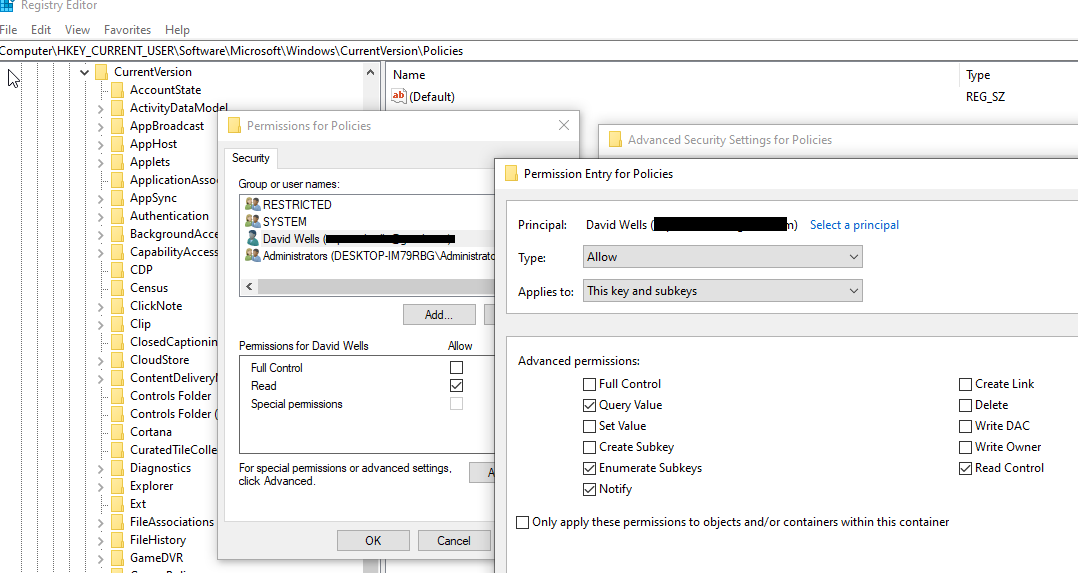 根据我们希望覆盖或添加的“策略”,我们需要找到与之相关的子键,这些子键可能不会都存放在用户注册表的同一个表项下。比如,在“Remove Task Manager”场景中,定义该策略的值位于\Software\Microsoft\Windows\CurrentVersion\Policies\System键中,因此我们需要在System子键上添加一个DENY规则,阻止SYSTEM获取该键的“写入/创建”权限,确保GpSvc无法执行覆盖操作。