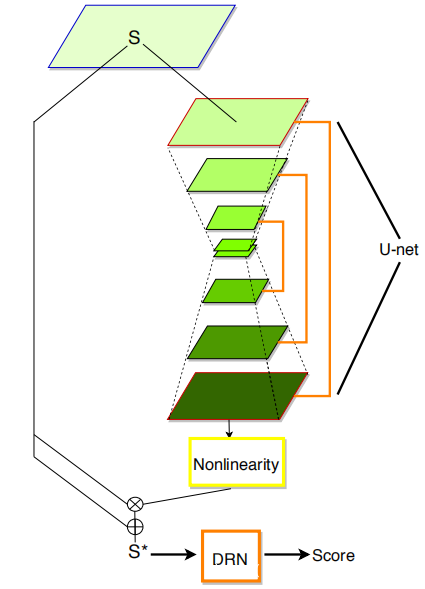 其中φ是诸如sigmoid或softmax的非线性变换,U是类似U-net的结构,由一系列下采样和上采样操作组成,而S是输入。如使用最大池进行下采样,使用双线性插值进行上采样。此外,在相应的自下而上和自上而下的部分之间添加了跳过连接,以帮助学习注意力权重。