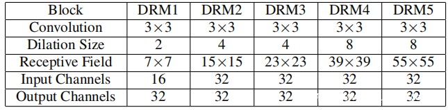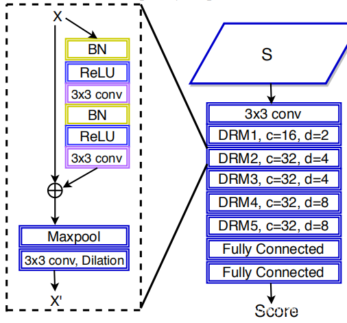 扩张(dilation)的残差网络由五个扩张的残差模块(DRM)组成,如下图右侧所示。每个DRM都有一个基于3×3 CNN的残差单元,其后是最大池化层和扩张的卷积层,如下图左侧所示。