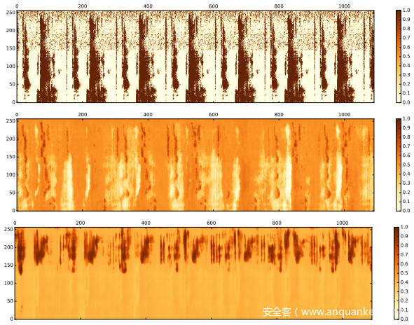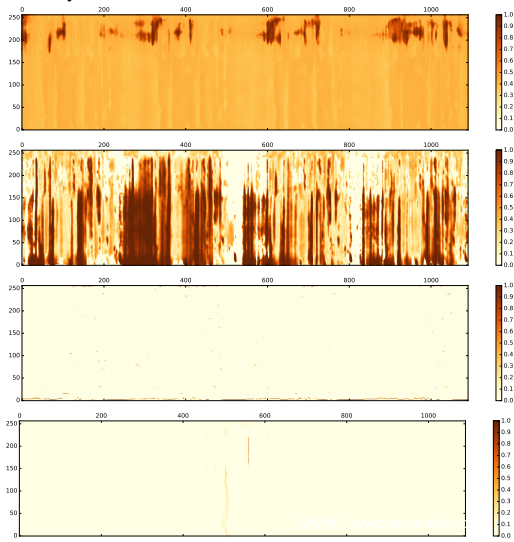 下图显示了不同实体非线性变换的注意力热图。看到SoftmaxT和SoftmaxF实施稀疏激活,而Sigmoid显示了多个时间和频率区间的激活。可以通过非线性如何缩放每个特征维来简单地解释激活的差异。 Sigmoid独立地缩放每个维度,而Softmax依赖地缩放每个维度,这意味着仅激活了几个维度,而大多数维度被抑制(如图所示,大多数值接近0)。 Softmax非常适合分类任务,但不适用于上下文,因为在每个上下文中,每个维度的规模对于检测重放攻击很有用。