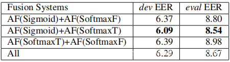 上图还表明,AF中的不同非线性激活功能采用了任务的不同方面,并且由于它们可能是互补的,因此决定使用Sigmoid,SoftmaxF和SoftmaxT激活函数融合多个AF系统。下表给出了融合系统的结果。不出所料,各个AF系统是互补的,将它们融合在一起可进一步降低EER。通过将两个AFN的输出与Sigmoid和SoftmaxT非线性融合,可以得到dev和eval的最佳结果分别为6.09和8.54。