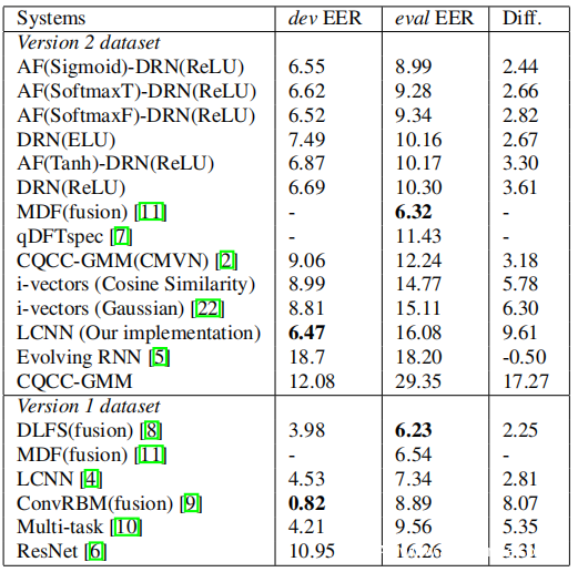 上表在等错误率(EER%)方面比较了各种系统。总体而言,提出的网络在2.0版数据集上取得了有竞争力的结果。具有ReLU激活功能的DRN系统在评估集上达到10.3 EER,具有ELU激活功能的DRN系统达到10.16 EER。通过在DRN中添加AF,可以进一步降低EER。检查不同的非线性激活函数的效果,使用Sigmoid的AF可获得8.99 EER,其后是SoftmaxT的9.28,SoftmaxF的9.34和Tanh的10.17。该表还显示了评估集和开发集上EER之间的绝对差值。这表明模型可能过度适合训练样本的程度。发现建议系统的这些差异很小,这表明即使从给出的不平衡小数据集中,模型也能很好地概括。