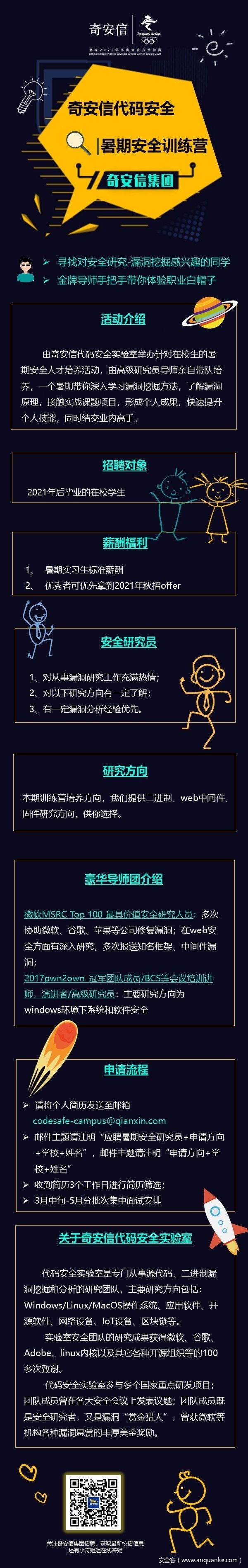 由奇安信代码安全实验室举办针对在校生的暑期安全人才培养活动,由高级研究员导师亲自带队培养,一个暑期带你深入学习漏洞挖掘方法,了 解漏洞原理,接触实战课题项目,形成个人成果,快速提升个人技能,同时结交业内高手。