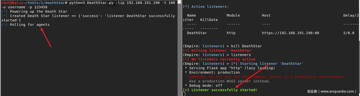 2、启动Deathstar,ip为攻击机ip,为了接管agent