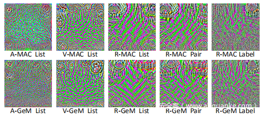 然后在上图中可视化从不同模型训练的扰动。第一行的扰动是从MAC池生成的,第二行的扰动是从GeM池生成的。从不同网络生成的每行的前三个扰动表现出很大的差异,而来自同一列的扰动具有相似的外观。这与转移攻击的结果一致。此外,成对关系和列表关系所产生的扰动比标签关系所产生的扰动更相似,这也可能表明分类攻击和检索攻击之间存在差距。