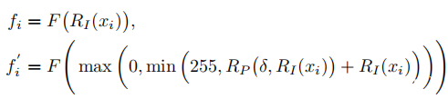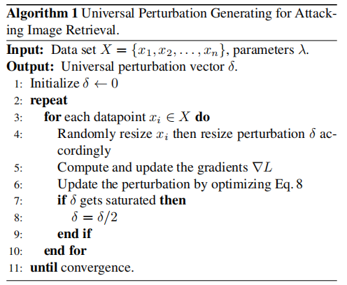 为了使建议的通用扰动适合于不同的大小,采用了随机调整大小的过程RI(·),它将大小为W×H×3的原始输入图像x调整为具有随机大小W’×H’×3的新图像RI(x) 。请注意,W’和H’在特定范围内,并且|W’W W H’H|应该在合理的小范围内以防止图像失真。然后,将UAPδ调整为新的扰动动RP(δ,RI(x)),其大小与RI(x)相同,以添加到输入图像中。
