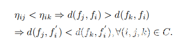 其中F(·)是通过CNN模型输出特征向量的函数,RI(·)和RP(·,·)分别是用于输入图像和通用摄动的调整大小运算符。 两个特征向量fi和fj之间的欧几里得距离被表征为函数d(fi,fj)。为了避免由大规模数据集引起的计算开销,预先计算将任何查询点与界标进行比较的基于界标(landmark-based)的顺序关系。
