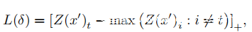 其中[x] +是max(x,0)函数,Z(·)是softmax层之前的输出,t是纯输入的标签,x’是受δ干扰的输入。