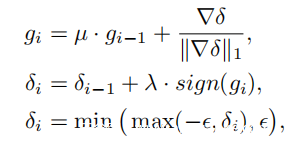 由于可以很容易地获得δ的梯度,因此采用具有动量的随机梯度下降来更新第i次迭代的扰动矢量:
