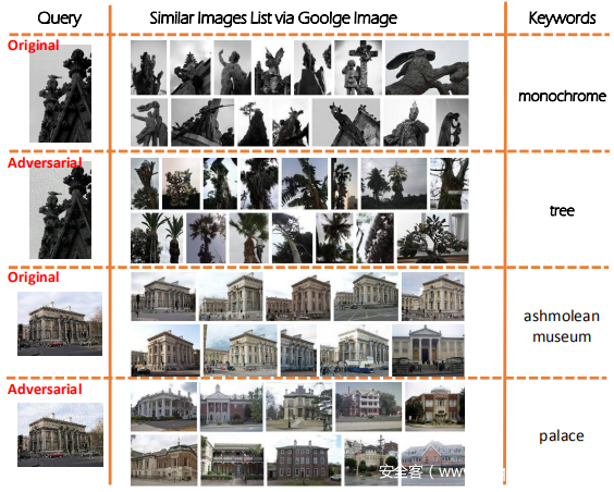 上图显示了在真实世界的图像检索系统(即Google Image)上的攻击结果。偶数行显示扰动的图像以及Google Image提供的检索到的图像和预测的关键字,这与原始行在奇数行完全不同。例如,原始输入被分类为单色,而对抗样本变为树。请注意,由于缺乏真实排名列表,它无法量化mAP下降。因此,对从Oxbuild5k和Paris6K数据集中随机采样的100张图像中,从损坏的图像的检索列表中删除从正确查询中检索到的图像的频率没有多少。对于此指标,模型实现了62.85%的缺席率。攻击结果表明,该方法可以产生通用扰动,以欺骗现实世界的搜索引擎。