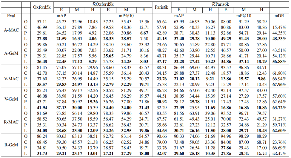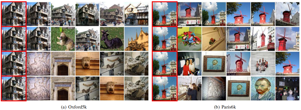 测试数据集: Oxford5k数据集由5,062张图像组成,并且对该集合进行了手动注释,以生成11个不同实体地标的全面真实界标,每个界标由5个可能的查询表示。与Oxford5k相似,Paris6k数据集含6,412张图像和55个查询。将Revisited Oxford5k和Revisited Paris6k数据集分别称为ROxford5k和RParis6k。在原始数据集和修订后的数据集上报告结果。