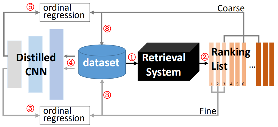 对于粗粒度部分,考虑保留整个排名列表的子集,该子列表保留全局排名信息以供蒸馏模型回归。具体地,根据索引将大的排序列表划分为多个盒,并且通过从每个盒采样一个参考来构造子集。优化子集上的蒸馏模型以适合相应仓之间的序数关系。形式化的,顺序回归目标定义如下: