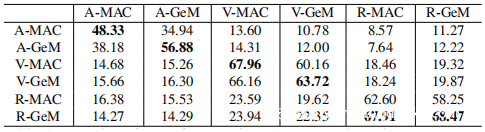 转移攻击是欺骗模型或数据集,并在另一个模型或数据集上产生扰动。上表显示了有关跨不同视觉特征的粘性转移的结果,其中报告了在所有四个评估数据集上计算的mDR。标签中的每一行。上面显示了给定模型制作的扰动mDR,每列显示了目标模型上的转移下降速率。通用扰动是在一种体系结构(例如V-GeM)上进行训练的,评估该体系结构的攻击能力是基于其他深层特征(例如R-MAC或V-MAC)来欺骗检索系统。有趣的是,从同一网络体系结构生成的通用扰动可以很好地转移到具有不同合并方法的相关模型。