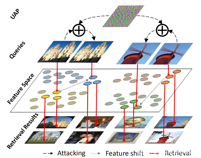 具体地说,图像检索攻击是使检索系统将不相关的图像返回到排名靠前的查询中。它对破坏图像检索攻击中特征之间的邻域关系起着重要作用。为此,提出了一种新颖的方法,即通过降级相应的排名指标来生成针对UAP的检索,以打破图像特征的邻域关系。