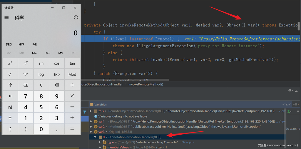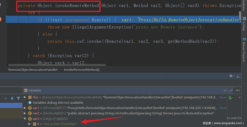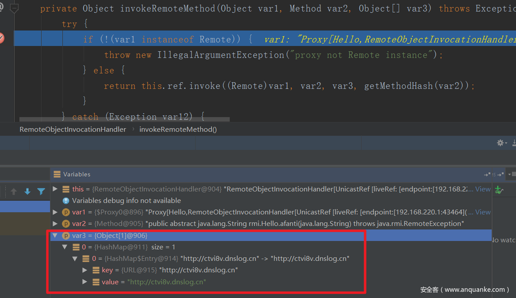 下断在跟一下,InvokeRemoteMethod的第三个参数已经修改为URLDNS gadget。