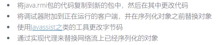 上面的第一种攻击方式也就是0c0c0f师傅说的:如果暴露的函数有对象类型参数,那么直接就可以利用,为什么能攻击成功呢?因为rmi是基于100%反序列化的。