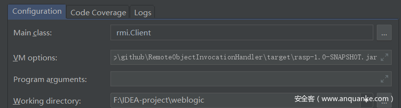 最后通过mvn package打包,运行RmiClient前,VM options参数填写:-javaagent:C:UsersxxxRemoteObjectInvocationHandlertargetrasp-1.0-SNAPSHOT.jar