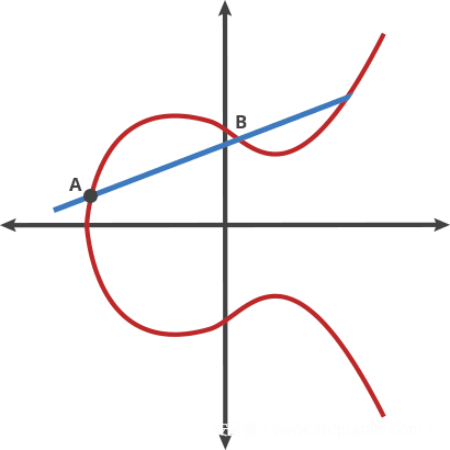 现有两个点A和B,如果要计算A+B,则将球放在A点,然后朝B点射击。当它撞击曲线,球将以平行于y轴的方向反弹至曲线的另一侧,得到结果C。通过相同的原理可计算出D(A+C)、E(A+D)。