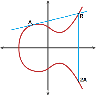 如果要计算2A(也就是A+A),就需要选择非常靠近A的点A’并朝其射击。随着A’越来越靠近A,它们之间的连接线也越来越靠近A的切线。也就是说,则将球放在A点,沿着椭圆曲线过A点的切线射击,球在撞击曲线后反弹至曲线的另一侧,得到结果2A。以和上图同样的思路可以计算 A+2A = 3A、A+3A = 4A 等。