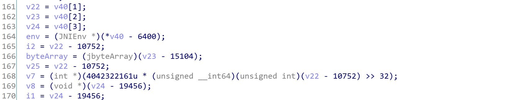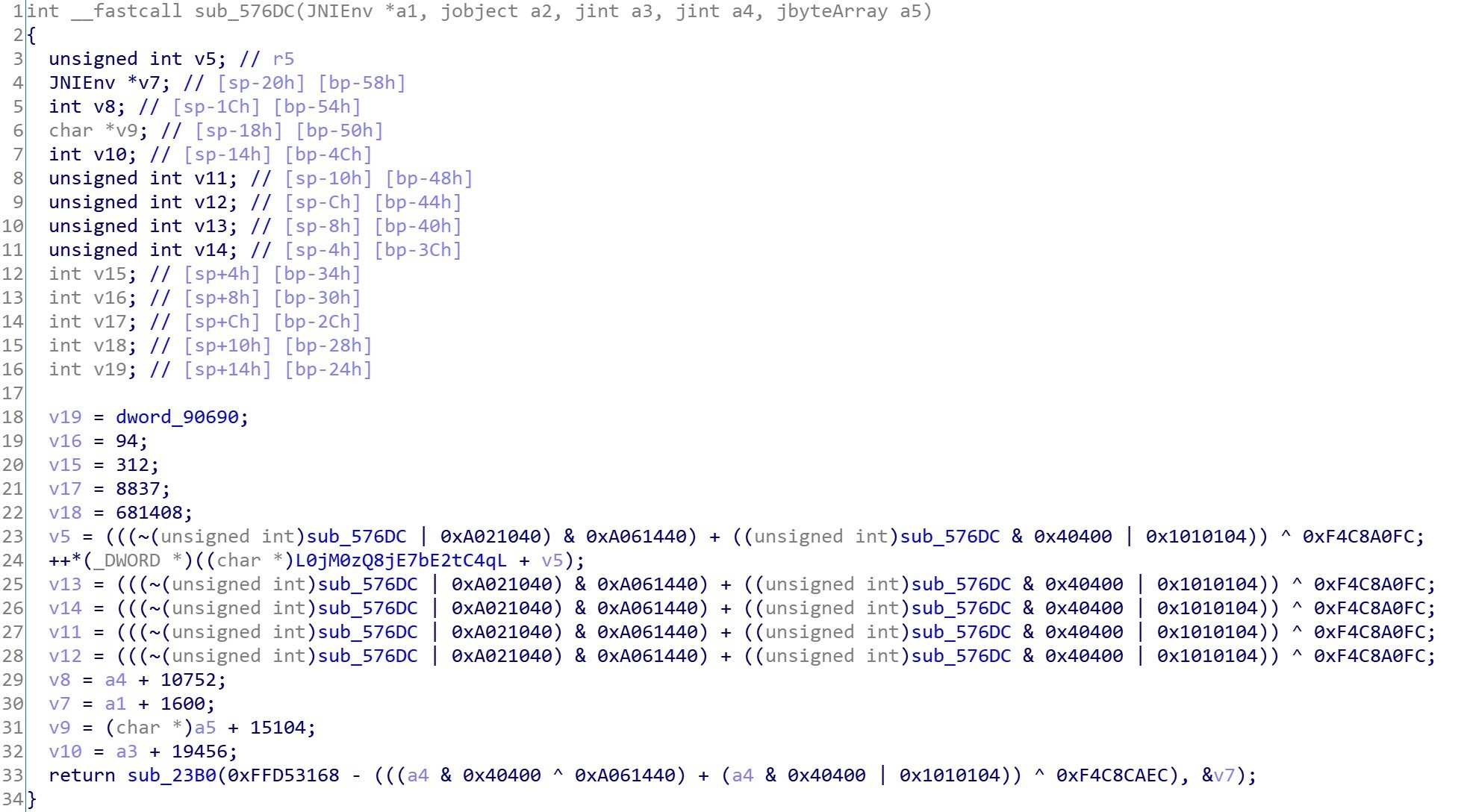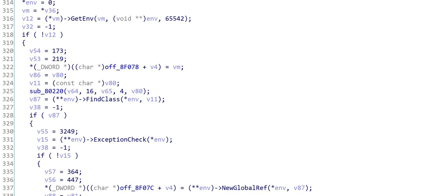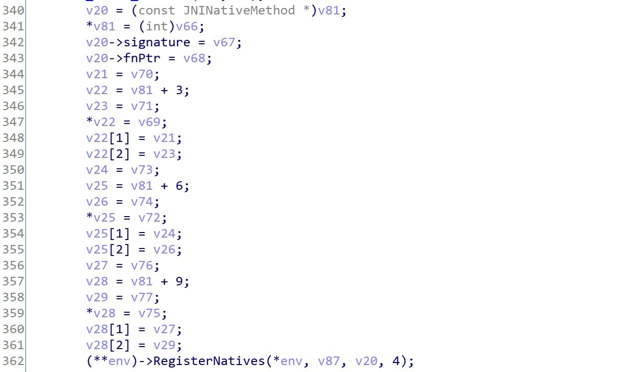 这次可以看到JavaVM指针被直接引用到,函数执行的流程也基本上一览无遗,该函数里主要对一些全局变量进行解密,解密成用于注册jni方法的字符串或是其他用途的重要数据。