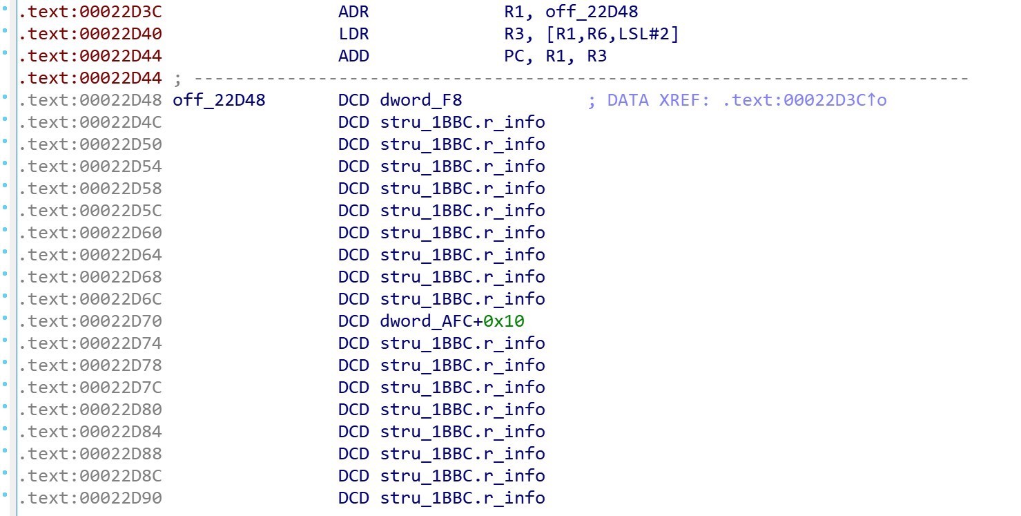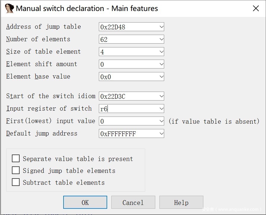 如上图r6是索引值,r1是跳转表基址,r3是跳转表索引到的值,最后跳转的位置即r1+r3。在ida依次选择Edit->Other->Specify switch idiom,为此处配置一个跳转表结构: