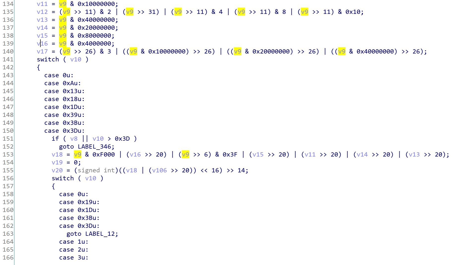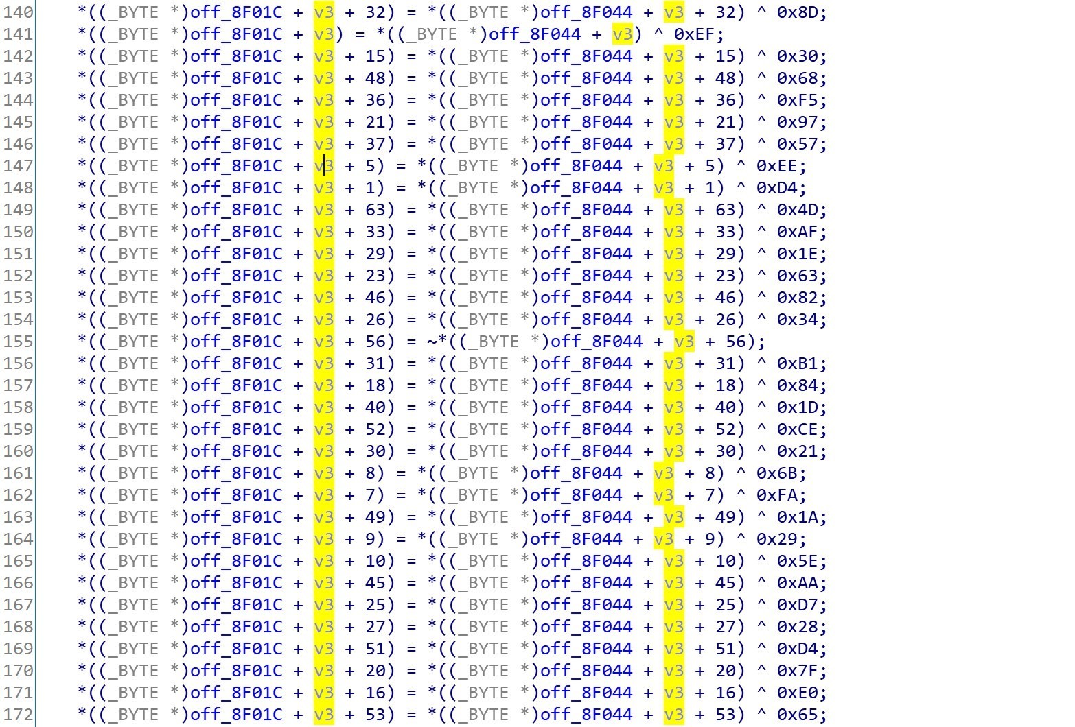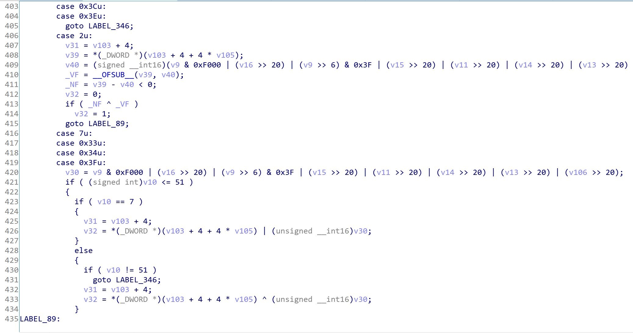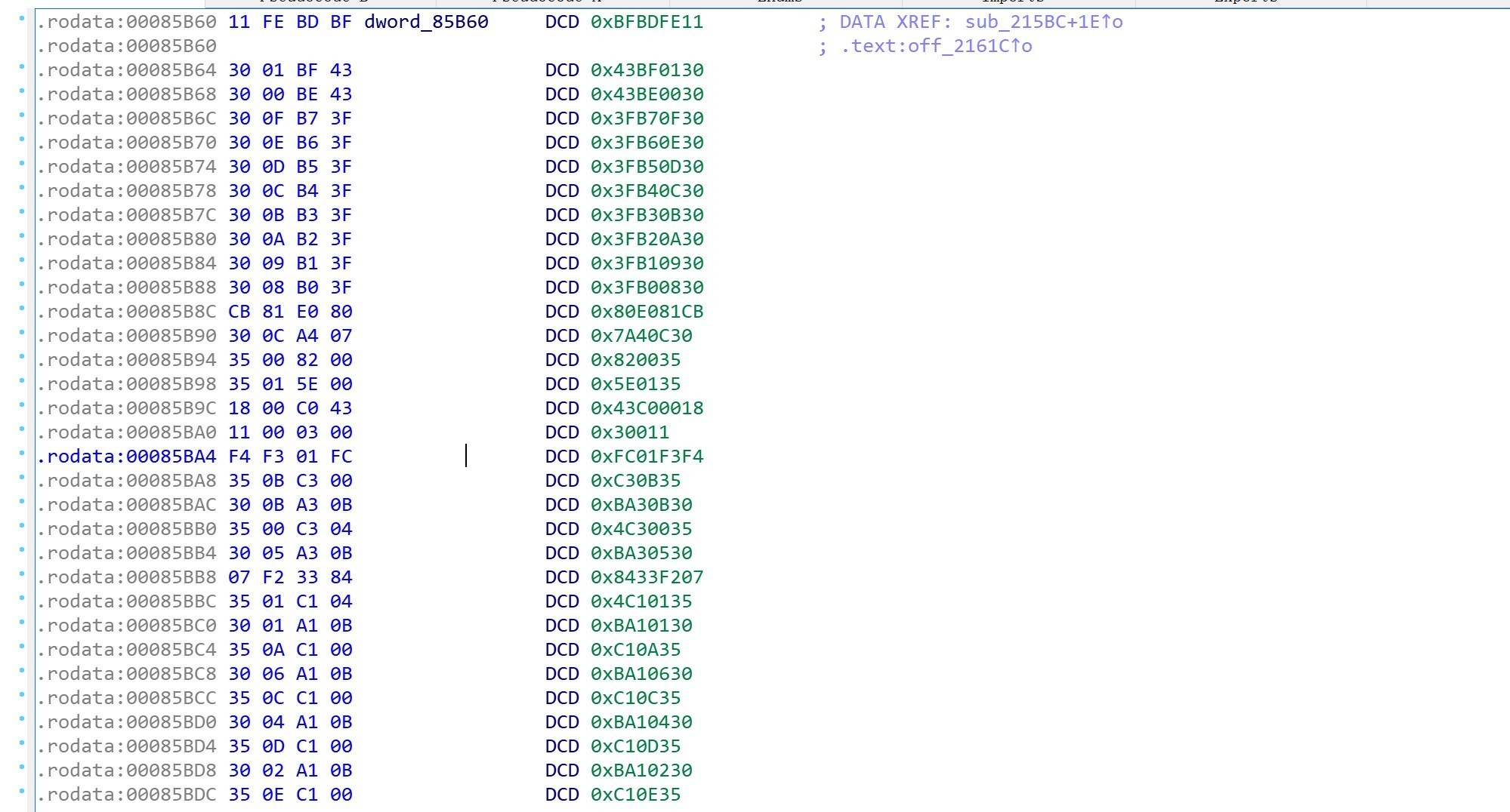 基本上无法解读,但大体上可以知道其结构,while循环内的switch-case结构,但多数case内又嵌套着另一层switch-case结构,形成多层嵌套,所以代码看起来比较复杂。而最外层switch的case索引,是通过读取从dword_85B60起始的一串数据表,再通过转换运算得到。该数据表内的数据相当于一条命令,不同的命令可以执行不同的case组合,完成不同的功能。