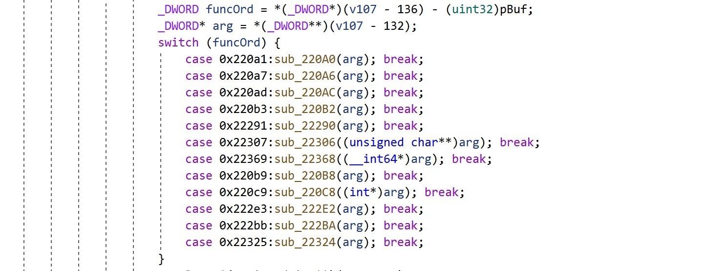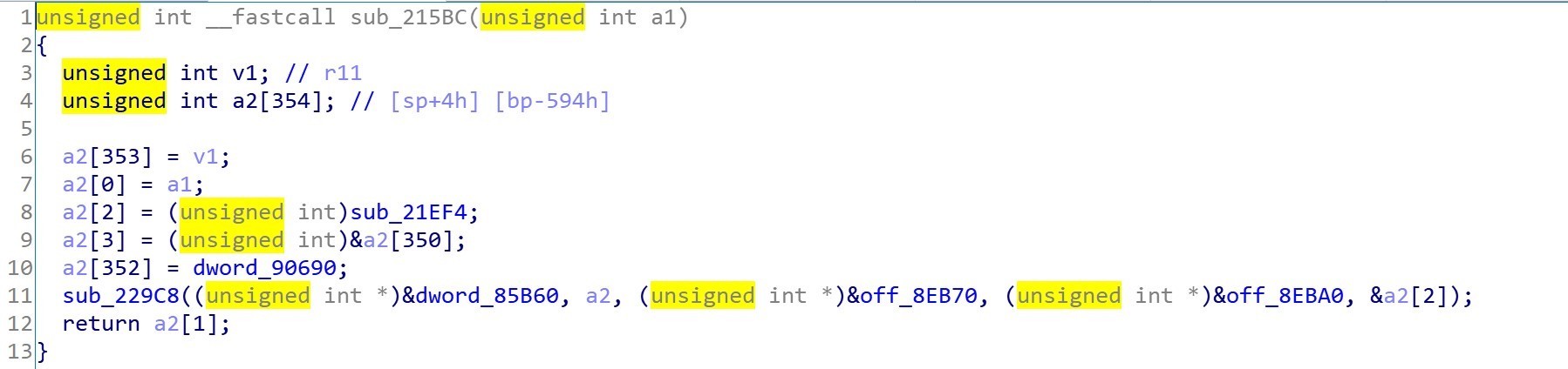 这里我对参数结构进行了一些转换,以便于更好的理解c代码,可以发现参数结构体作为一个数组的成员继续传入到下一层,继续跟进到sub_229C8:
